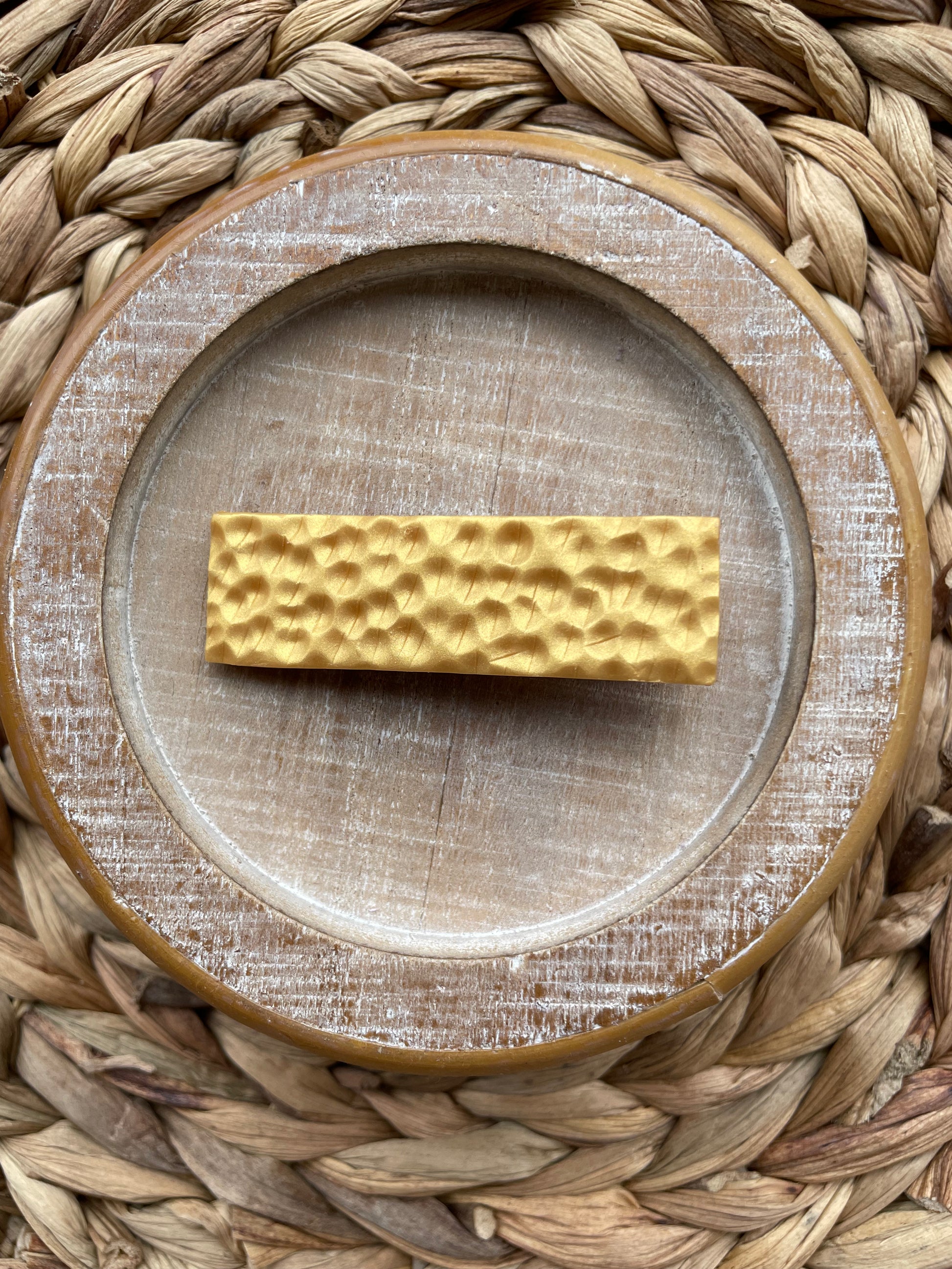 This hair barrette features gold clay with a texture to resemble hammered metal.