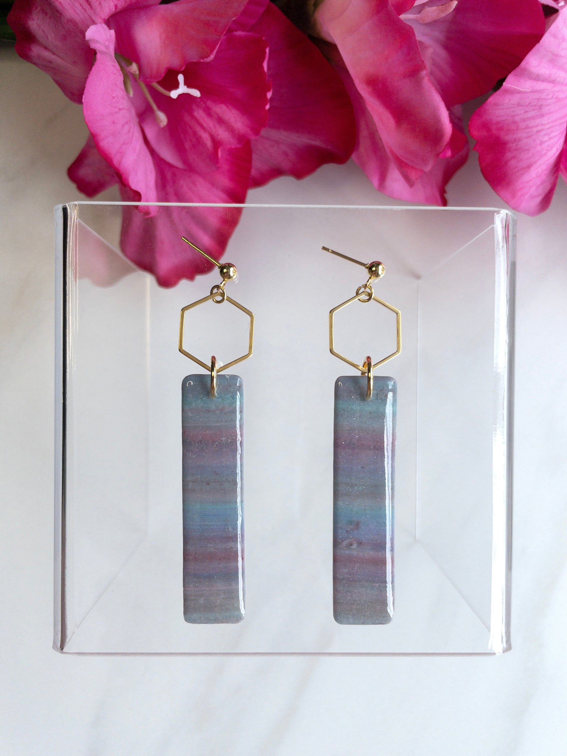 These lightweight polymer clay earrings are comfortable for all-day, everyday wear. This pair features various colors of clay, a shiny resin finish, and brass hexagon-shaped charms.