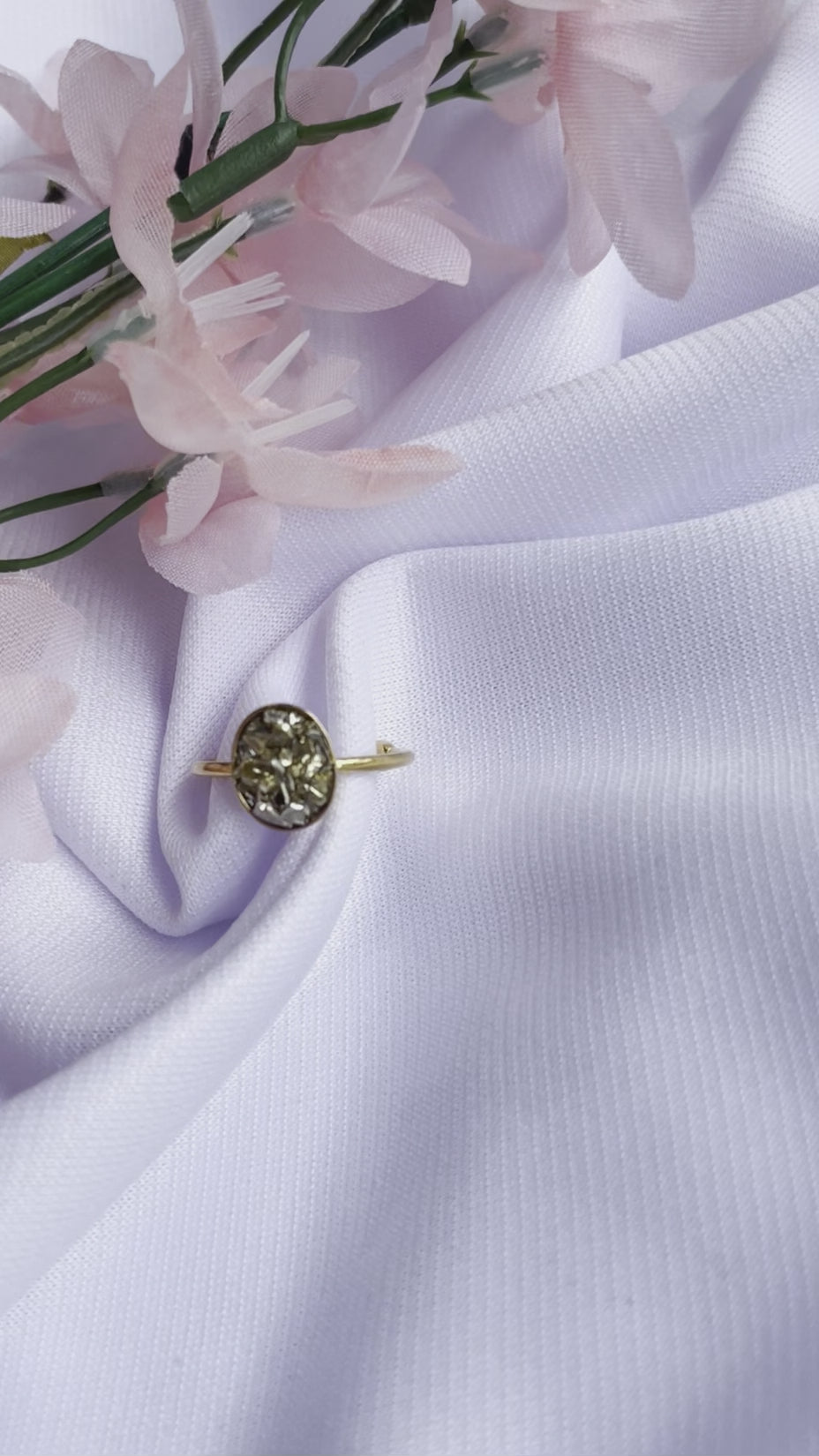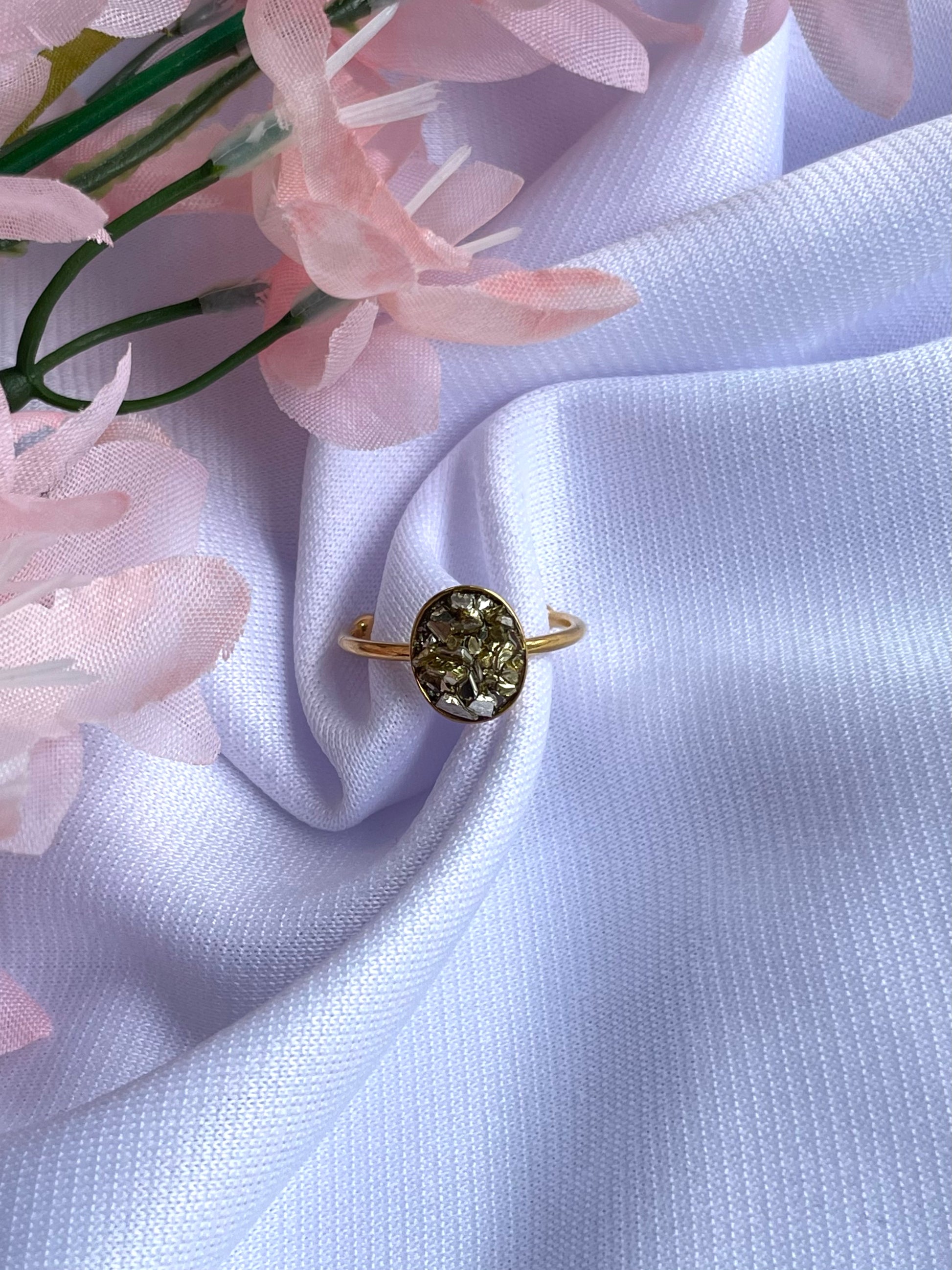 This unique, handcrafted ring features resin and crushed glass on an adjustable stainless steel base.