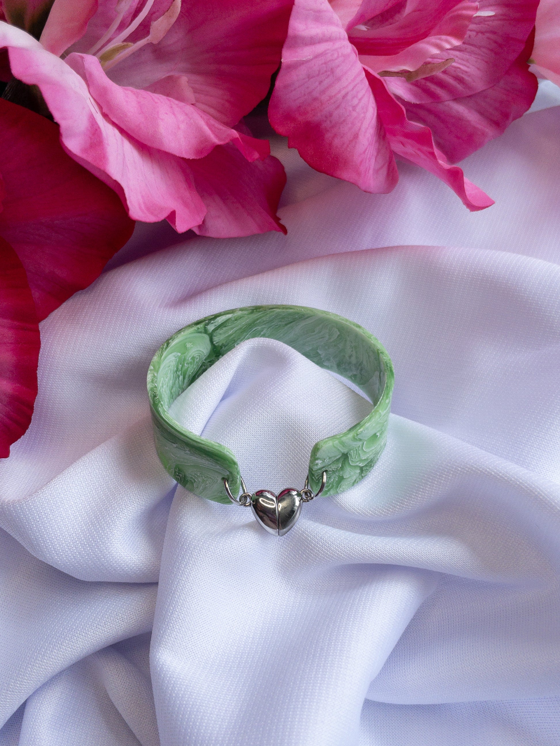 This bright, trendy cuff bracelet features polymer clay and paint with a stainless steel, heart-shaped magnetic clasp.