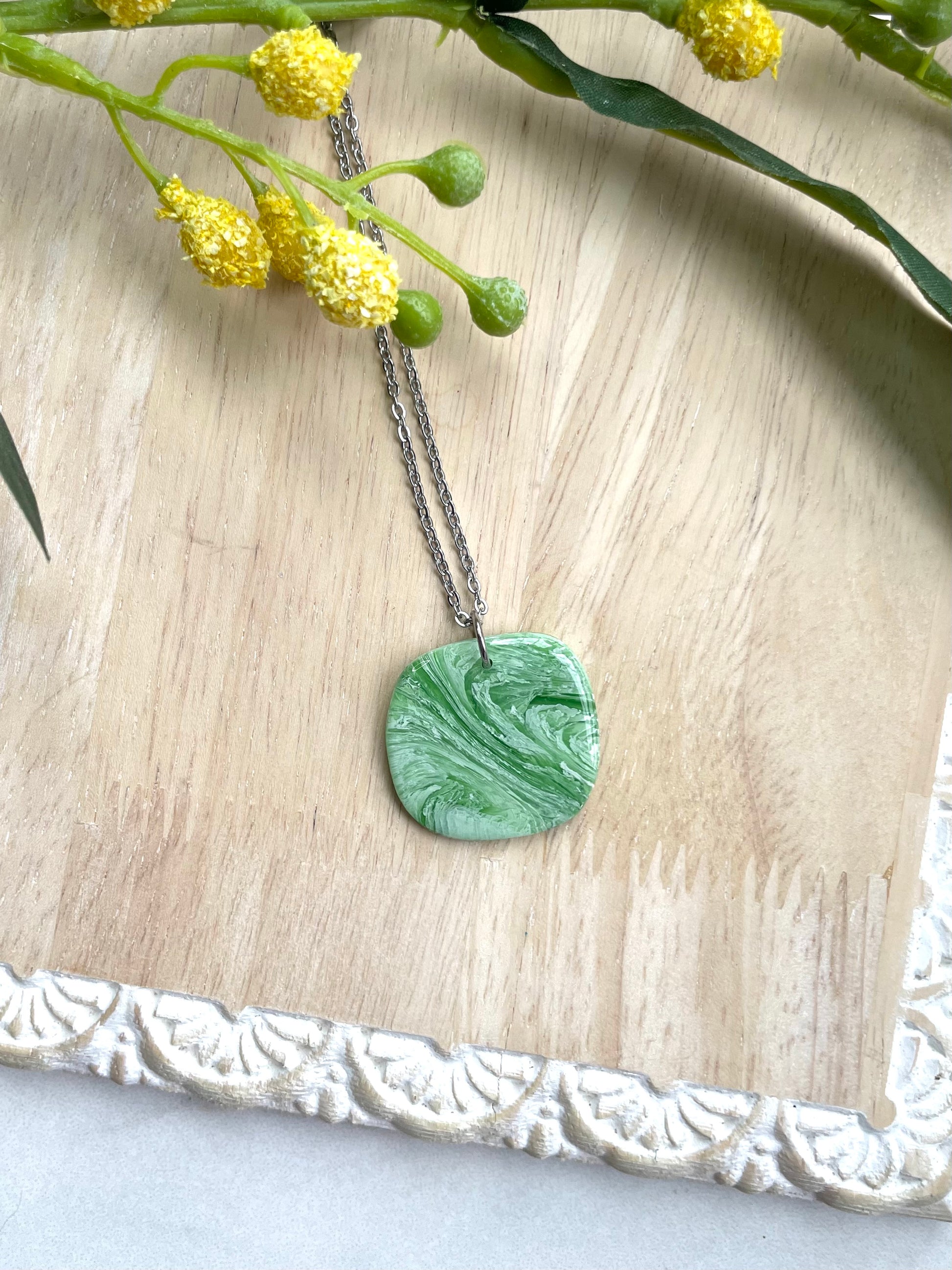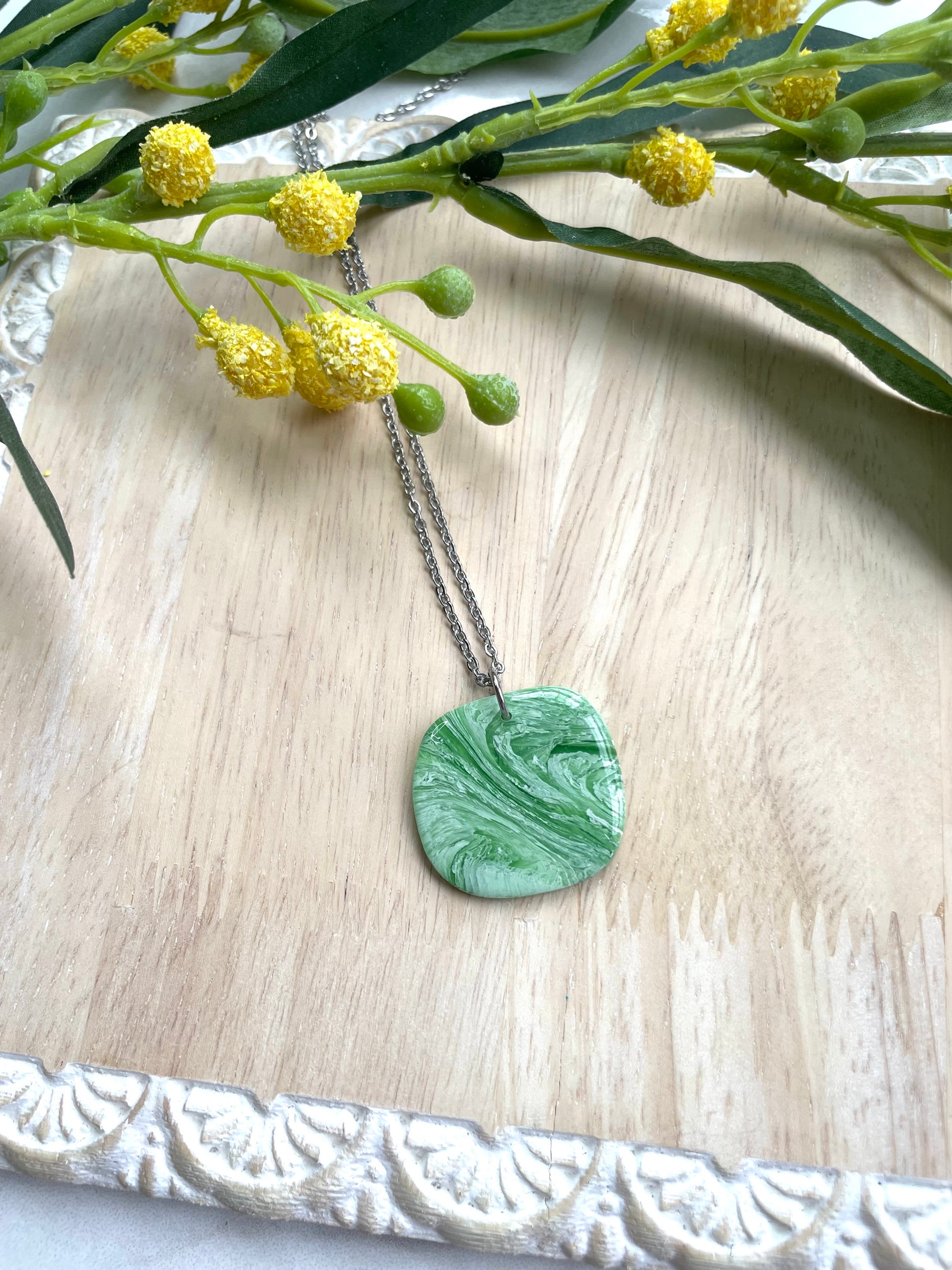 This unique necklace features green polymer clay and white paint with a resin finish on a hypoallergenic, stainless steel snake chain.