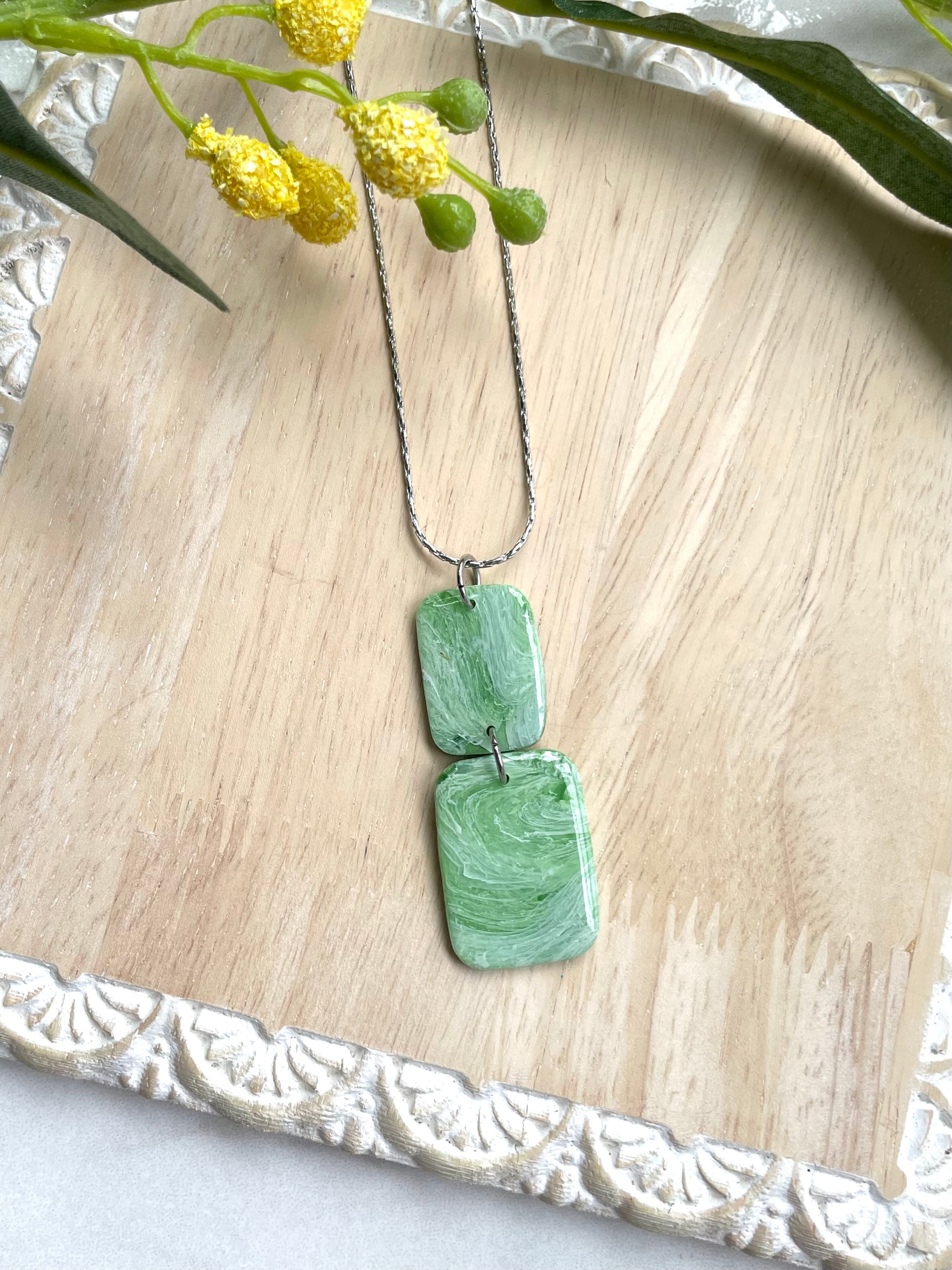 This unique necklace features green polymer clay and white paint with a resin finish on a hypoallergenic, stainless steel snake chain.