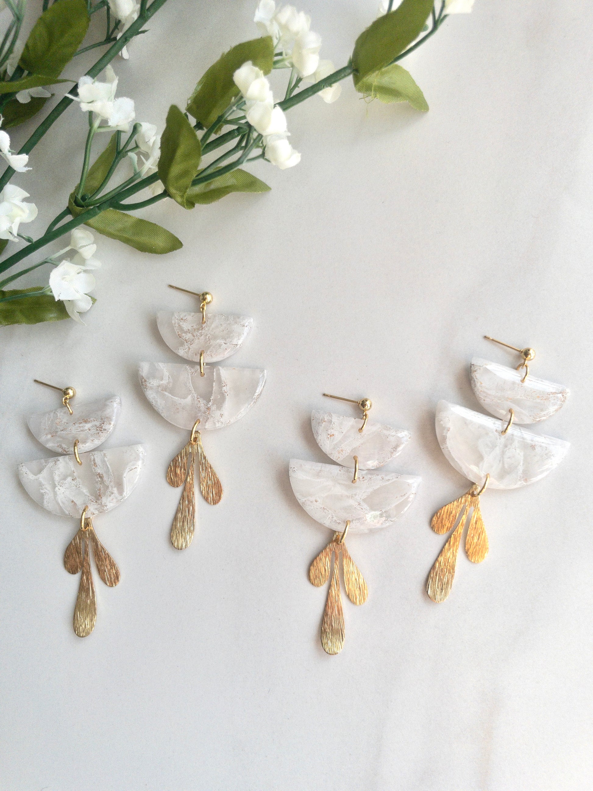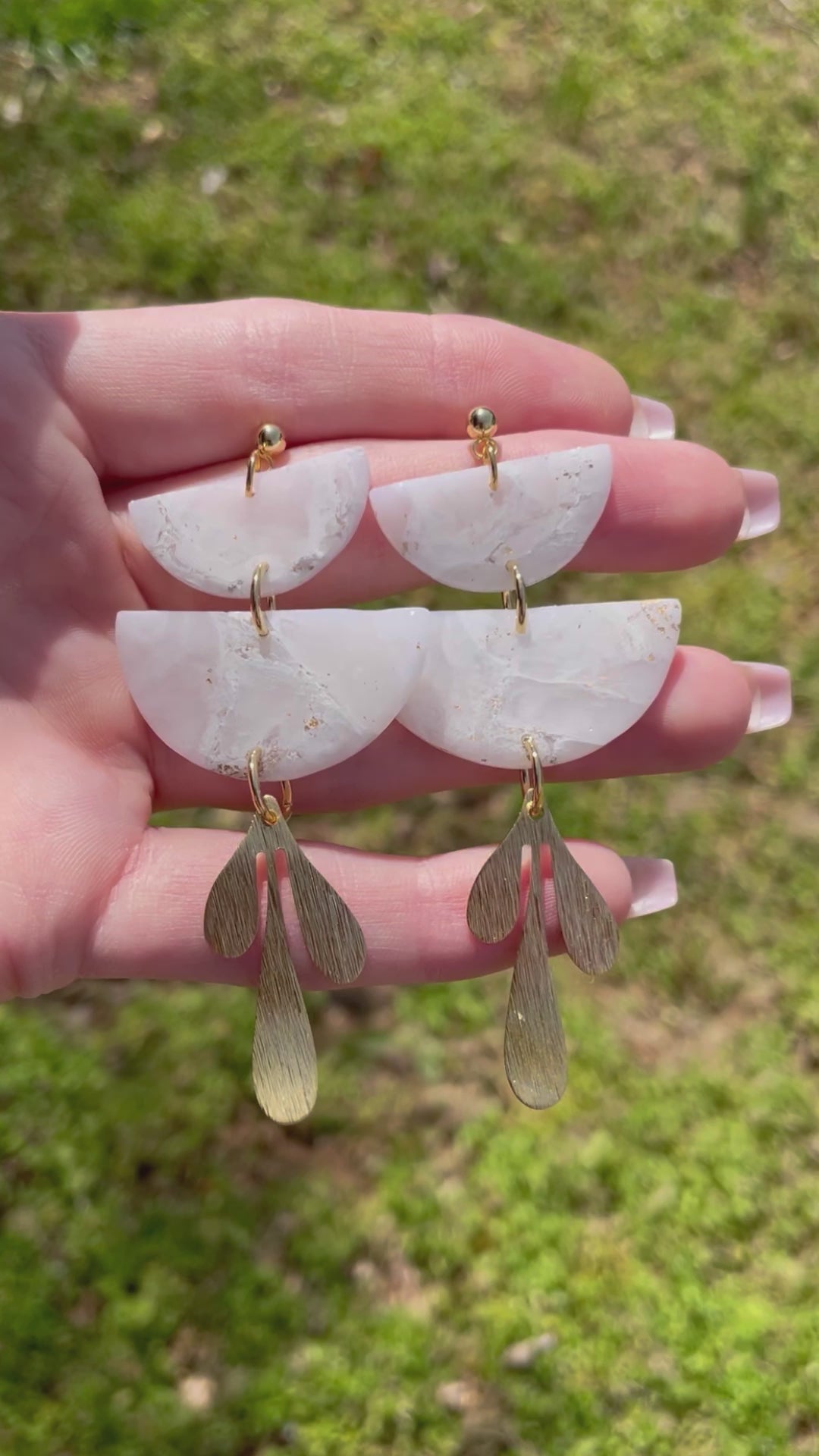 White & Gold Marble Clay Earrings | Semi-Circles with Leaf Charm